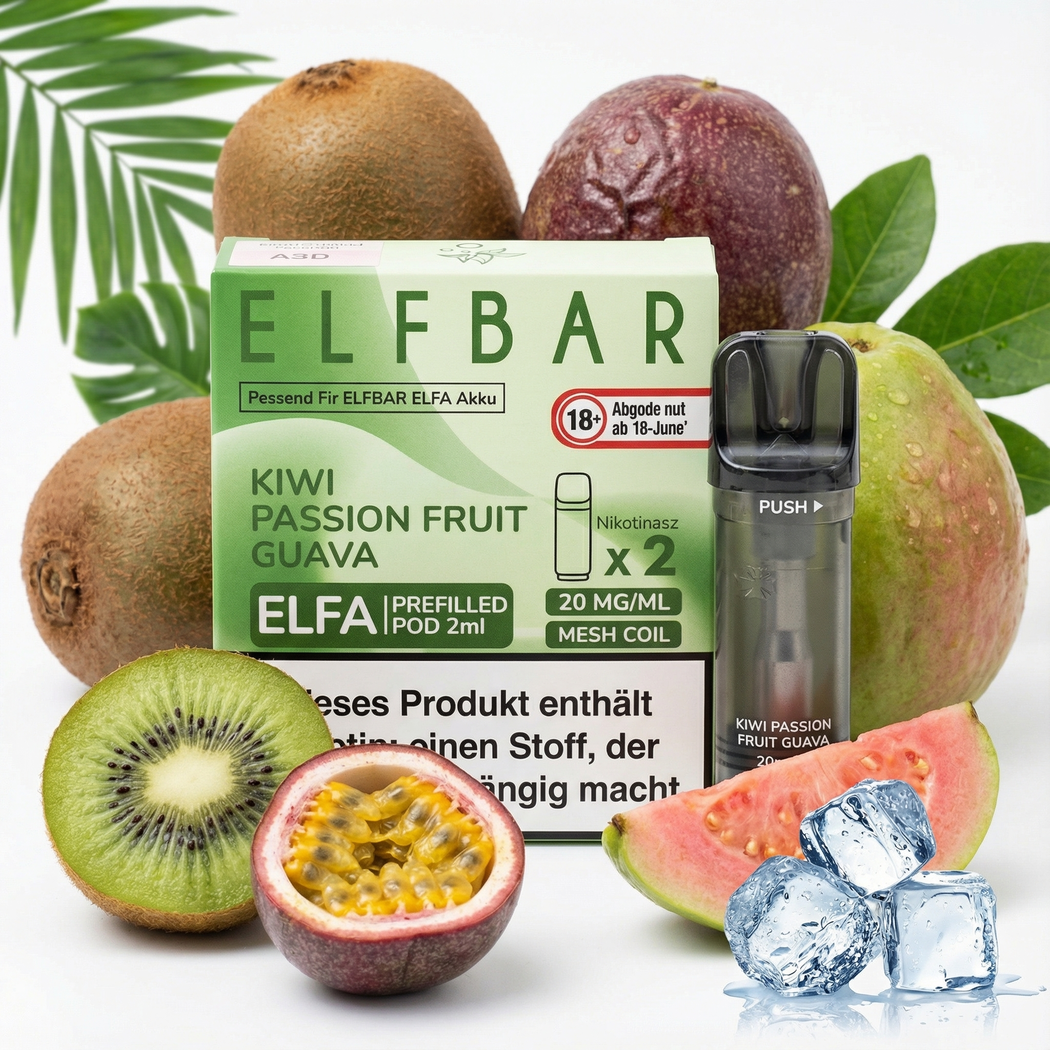 Die Elfbar ELFA Kiwi Passion Fruit Guava Pods vereinen drei exotische Früchte zu einem einzigartig fruchtigen Erlebnis. Die spritzige Kiwi, die aromatisch-säuerliche Maracuja und die süß-saftige Guave verschmelzen zu einem tropischen Geschmack mit angenehmer Frische.