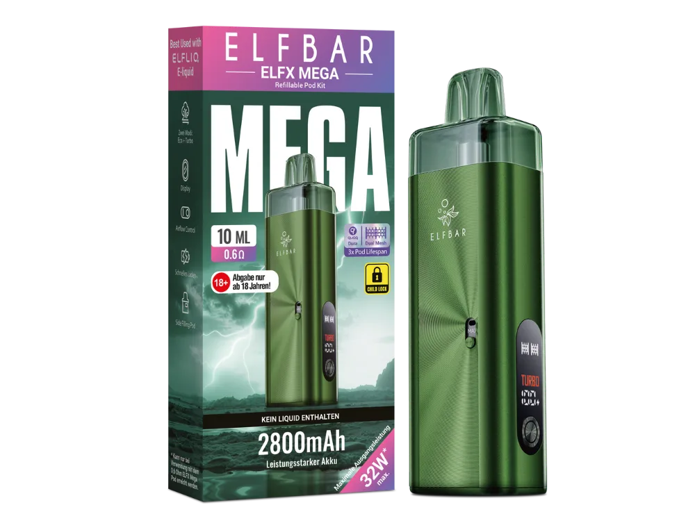| PRODUKTBESCHREIBUNG | Die Elfbar ELFX Mega E-Zigarette ist ein leistungsstarkes Pod-System mit moderner Technik und hoher Akkukapazität. Sie eignet sich für den täglichen Einsatz und bietet durch Eco- und Turbo-Modus eine flexible Leistungsanpassung bis zu 32 Watt. Das integrierte Farbdisplay zeigt alle relevanten Informationen übersichtlich an. Dank Zugautomatik, regulierbarer Airflow und Side-Filling-System ist die Handhabung besonders einfach. Der mitgelieferte Pod mit Dual Mesh Coil ist sowohl für MTL- als auch für RDL-Dampfen geeignet und verfügt über ein Tankvolumen von 10 ml. Die ELFX Mega wird über USB-C geladen und wird inklusive Pod und Gebrauchsinformation geliefert. |